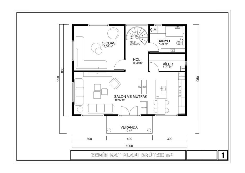 - 80 m² zemin kat + 80 m² birinci kat + veranda ve geniş teras planı